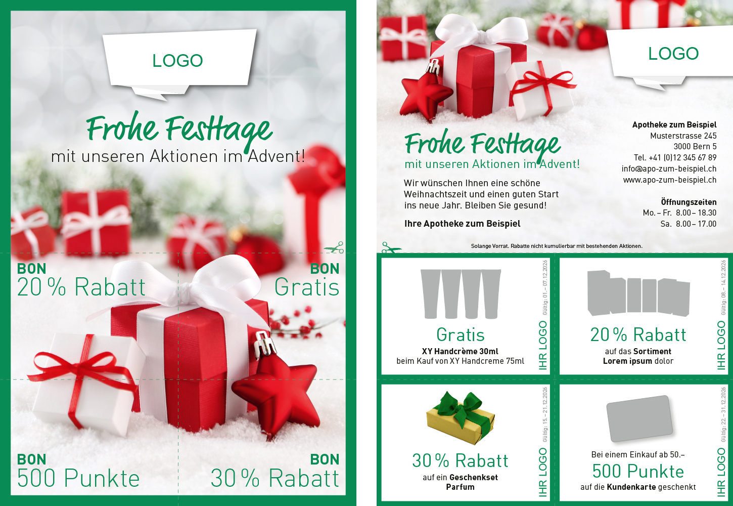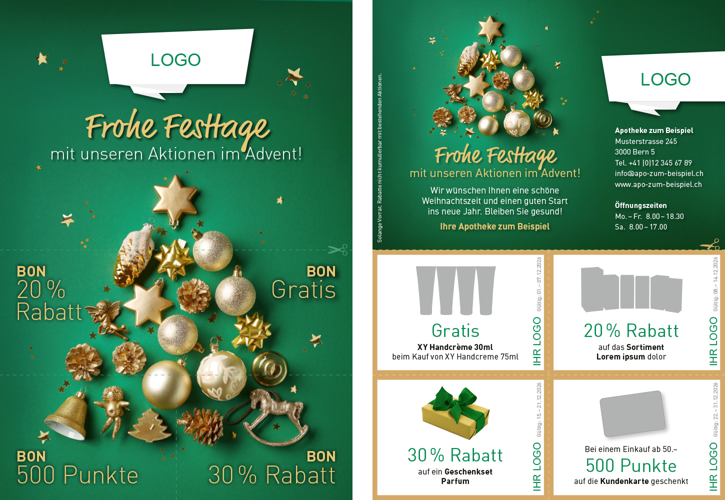 Der Flyer wird auf der Vorderseite mit dem gewünschten Weihnachtsdesign und dem Apothekenlogo bedruckt. Auf der Rückseite befinden sich persönliche Weihnachtsgrüsse, der Absender der Apotheke und 4 Aktionsbons zum Abtrennen.