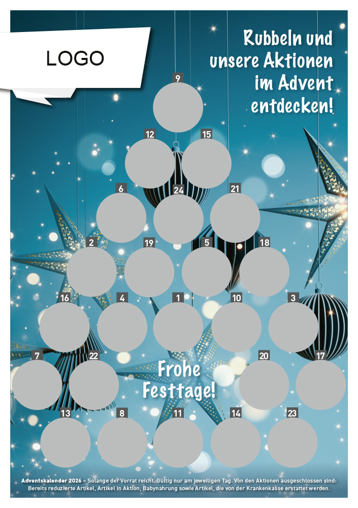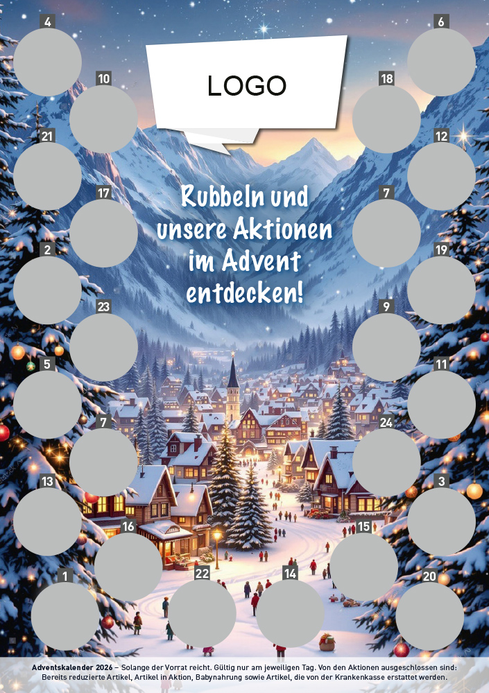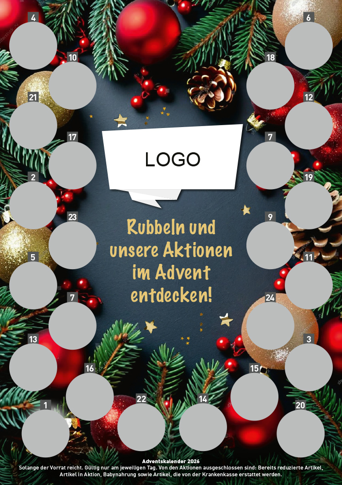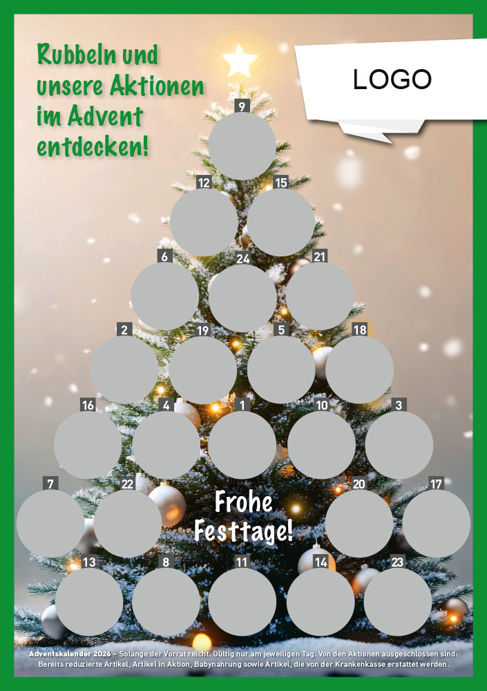 Vorderseite: Apothekenlogo, Aufforderung zum Rubbeln, 24 Adventstage