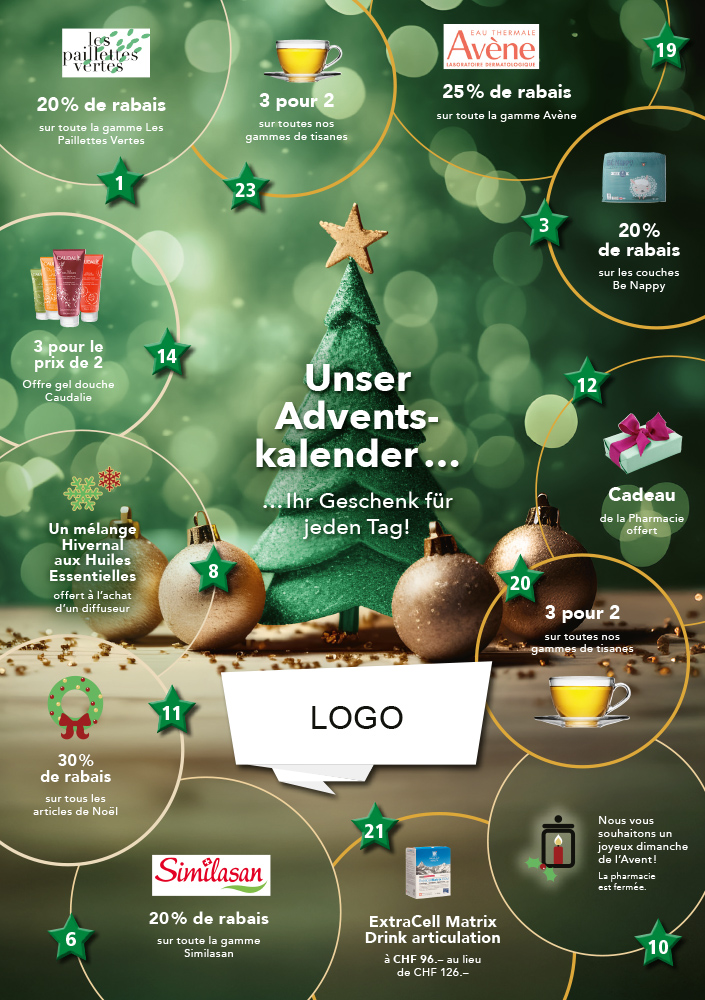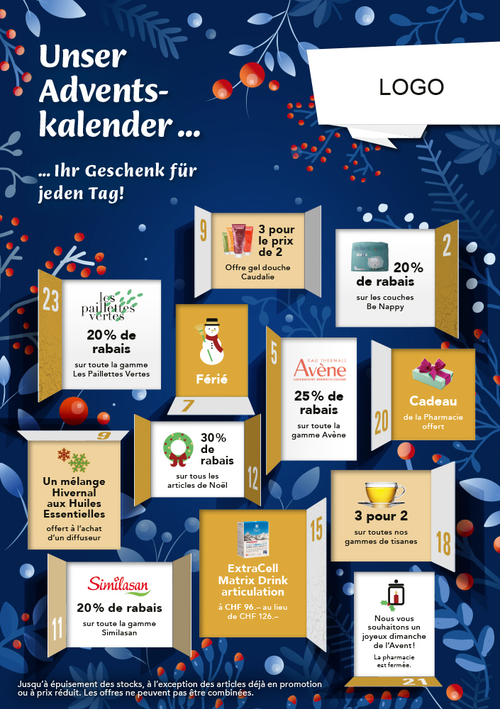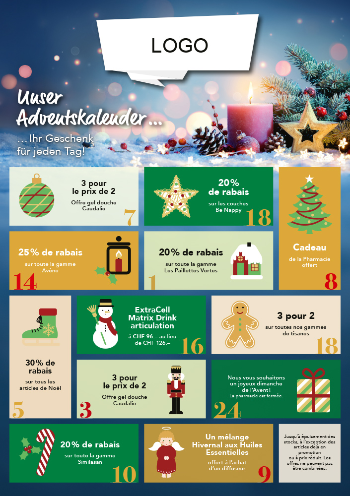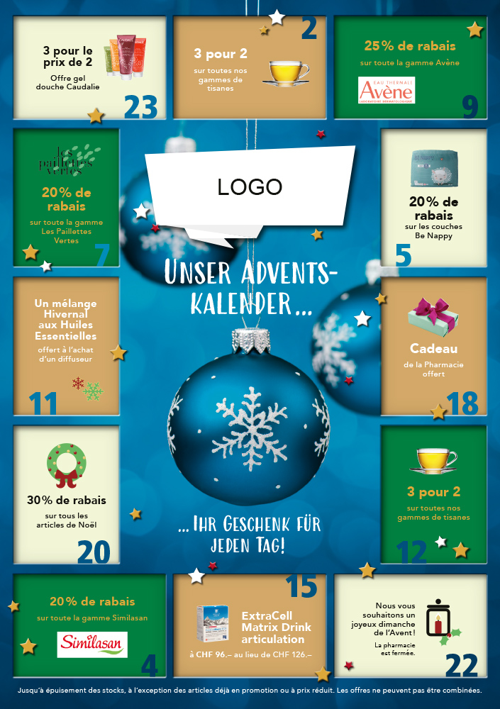 Der Standardkalender hat 24 deutlich sichtbare Adventsaktionen, verteilt auf 2 Seiten. Die Adventsaktionen können mit einem Bild visuell dargestellt werden. Auf der Vorderseite befinden sich kurze Adventsgrüsse, auf der Rückseite die Adresse und Öffnungszeiten der Apotheke.