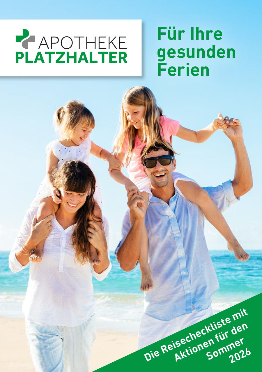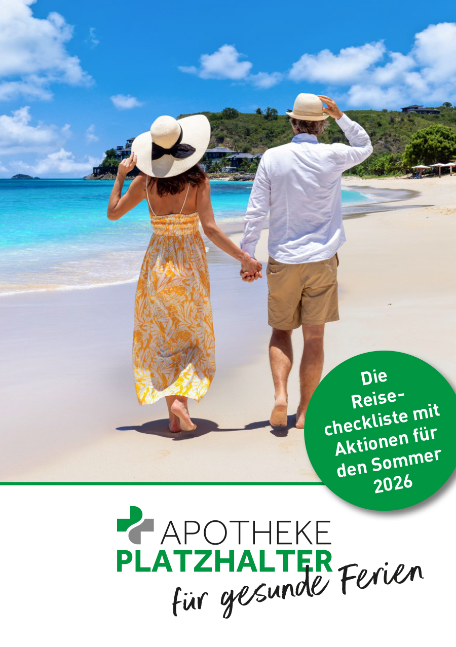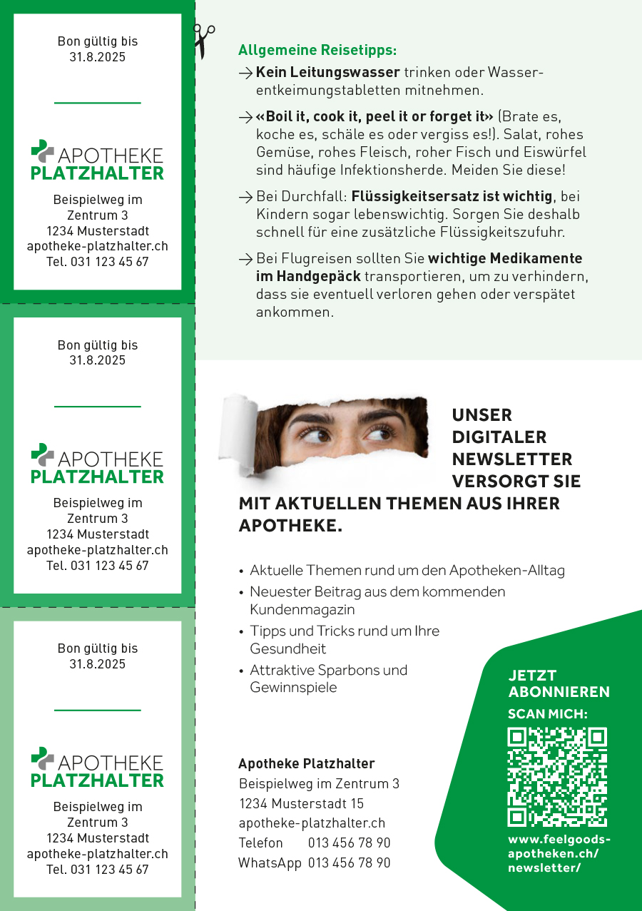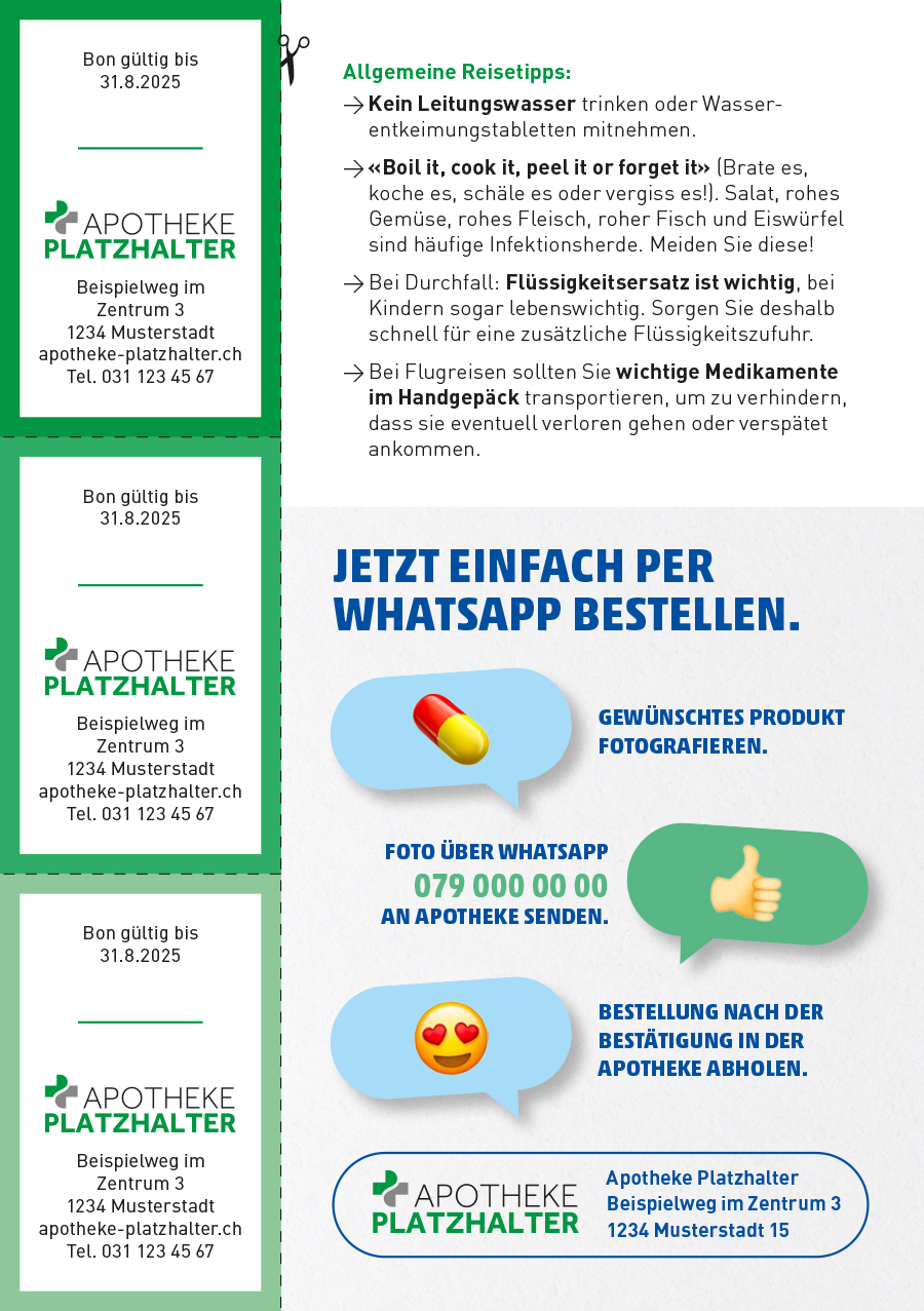 - Rückseite: Allgemeine Reisetipps, Logo und Adresse der Apotheke, der untere Bereich wird durch die Apotheke bestimmt (Tipp aus unserer Apotheke / Kundenkarte / pic and collect / Personalisierter Newsletter)