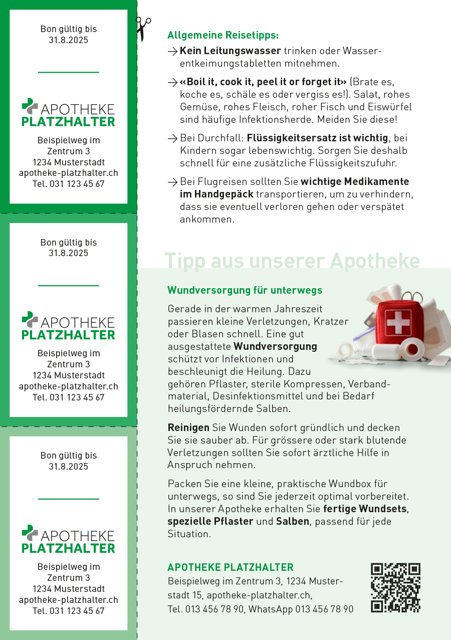 Personalisierung mit Logo und Farbe der Apotheke - Innenseite: Reisecheckliste, 3 Aktionsbons der Apotheke, nützliche Links, Möglichkeit für handschriftliche Ergänzungen